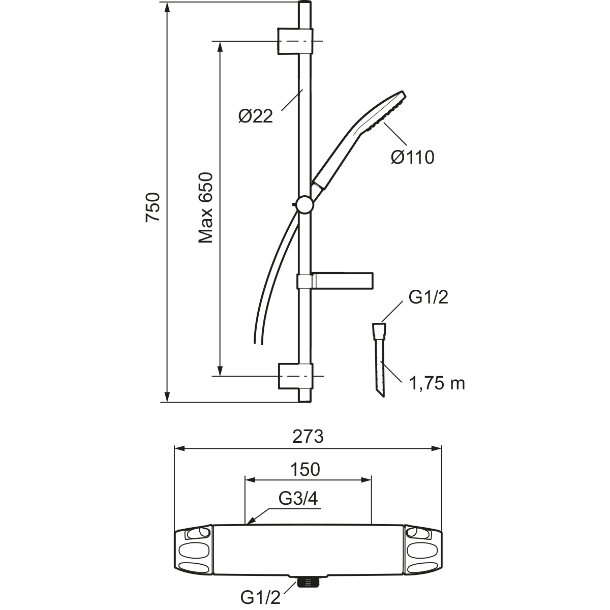 - Brusestang med håndbruser Ø110 mm, kalkafvisende si, 1750 mm bruseslange og sæbeskål.