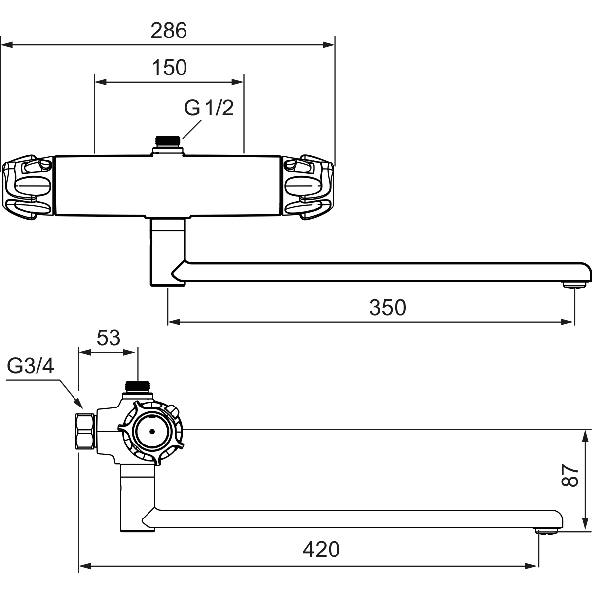 - Temperature handle with safety stop 38°C