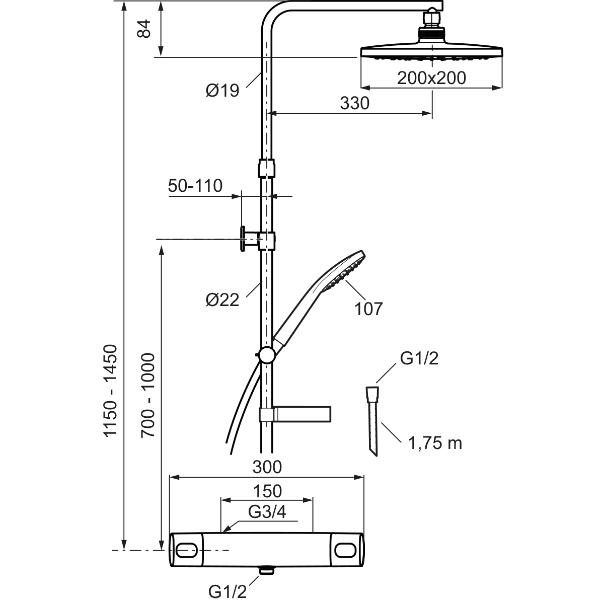 - Väggfäste fritt justerbart i höjdled, 700–1000 mm från anslutning och 50–110 mm utsprång från vägg, 2x20 mm distanser medföljer, med väggtätning, dold rörskarv