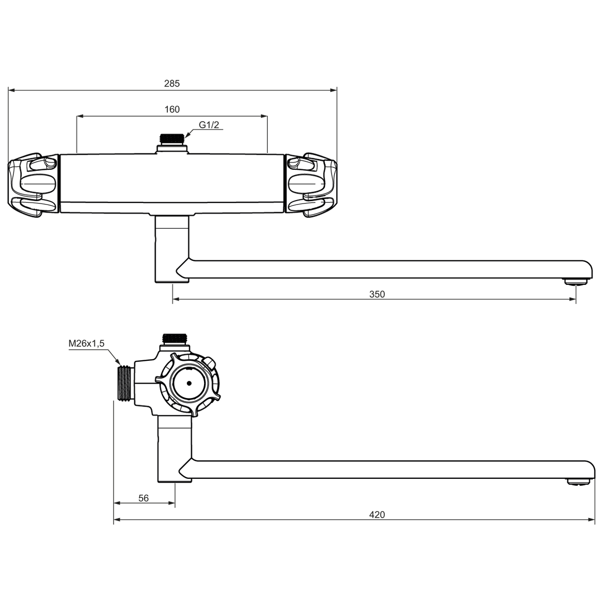 Tryckbalanserad termostatblandare med typgodkända backventiler och svängbar pip.