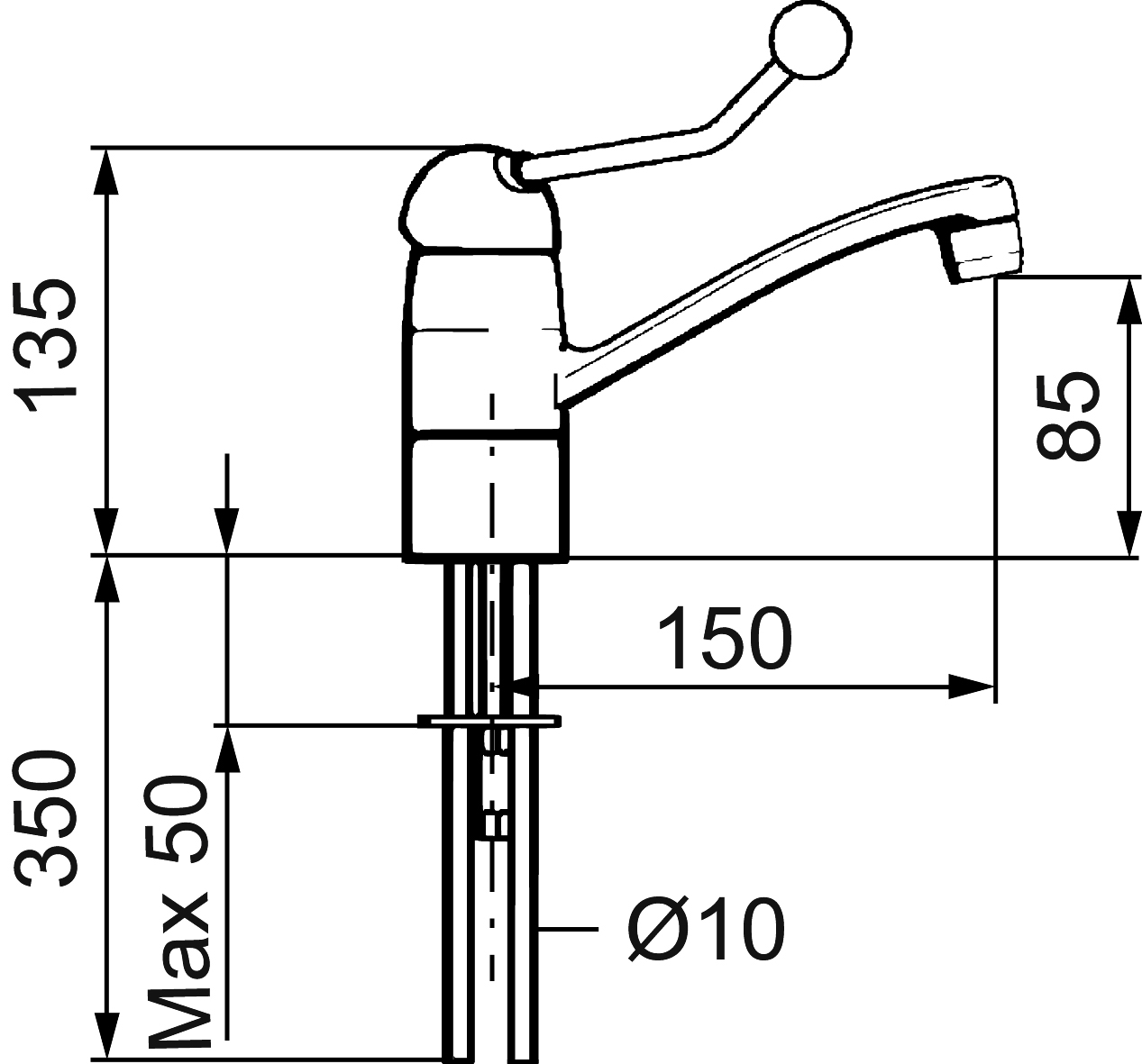 En tvättställsblandare med extra långt piputsprång, svängbar pip och 190 mm spak, för enkelt och säkert handhavande. Finns även med fast pip.