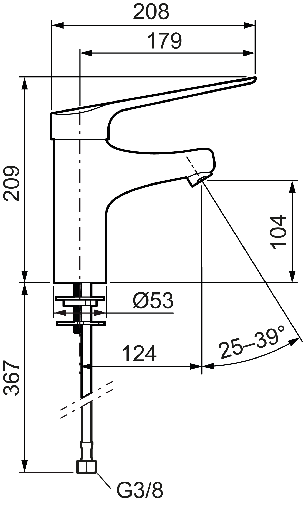 - Förlängd pip för att minska risken att strålbilden träffar tvättställets bottenventil, piputsprång 124 mm